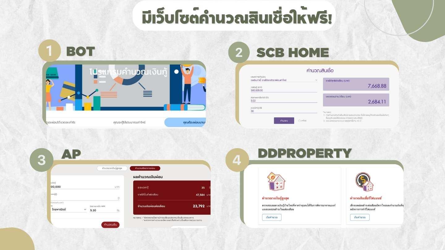 มีเว็บไซต์คำนวณสินเชื่อให้ใช้ฟรีเพียบ! อยากรู้ว่ากู้บ้าน กู้คอนโด หรือสินเชื่อส่วนบุคคลแล้วต้องผ่อนเท่าไหร่? หรืออยากเปรียบเทียบดอกเบี้ยระหว่างธนาคารต่างๆ ว่าที่ไหนคุ้มค่าที่สุด? ไม่ต้องกังวลไป! เพราะตอนนี้มีเว็บไซต์คำนวณสินเชื่อออนไลน์มากมายที่ช่วยให้คุณคำนวณได้ง่ายๆ เพียงแค่กรอกข้อมูลเล็กน้อย ก็รู้ผลทันที!