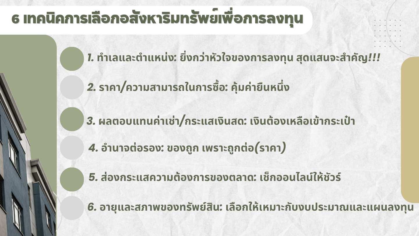 6. อายุและสภาพของทรัพย์สิน: เลือกให้เหมาะกับงบประมาณและแผนการลงทุน